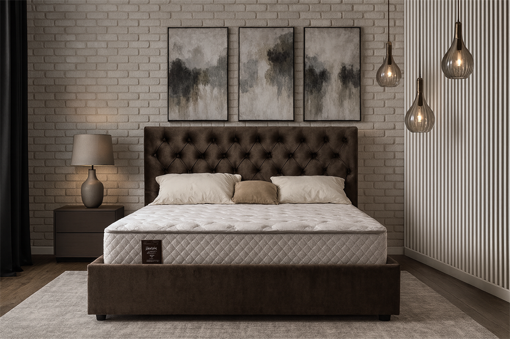 Элегантная интерьерная кровать с изголовьем, украшенным декоративными пуговицами и глубокой пиковкой. Модель изготовлена из ДСП. В комплект кровати входит кроватное основание. Каркас основания выполнен из металла, ламели - из берёзы.