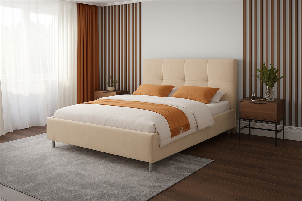 Модель с крупными квадратами и декоративной отстрочкой. Может быть исполнена в экокоже, велюре или рогожке. Комплектуется вместительной системой хранения на безопасных и прочных газовых механизмах подъема. Ортопедическая решетка разборная.