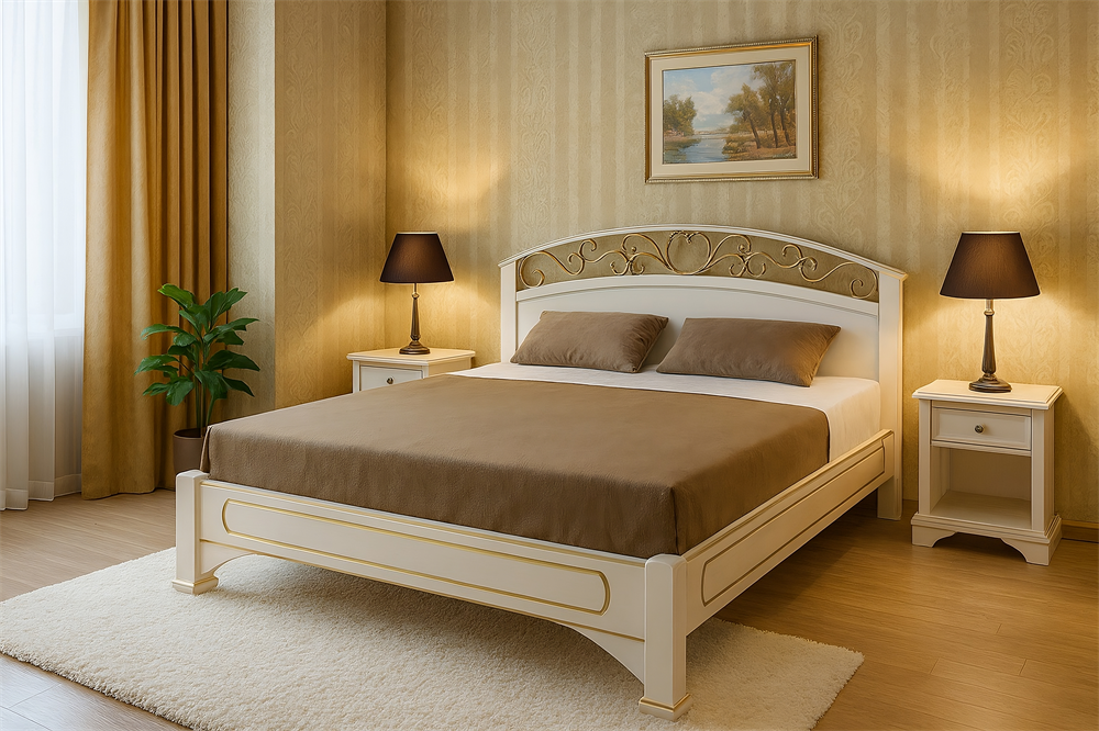 Данная модель исполняется с одной спинкой. Массив березы. Цвет орех, береза и отделка "Элит". Декоративная вставка - художественная ковка, патинированная золотом или серебром.
