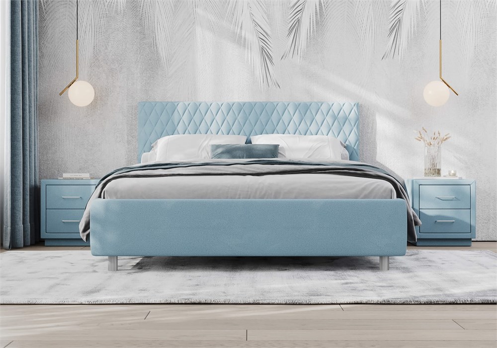 Прямую форму изголовья декорирует мягкий чехол. Чехол изголовья простеган ромбами среднего размера, что добавляет модели объем и подчеркивает выразительность. Кровать Stella лаконична, нейтральна, не берет на себя много внимания поэтому органично впишется в большинство современных интерьеров. Увеличенный просвет от пола позволяет облегчить уборку под кроватью, в том числе роботом–пылесосом. Царги кровати выполняются по технологии съемного чехла. При необходимости кровать может быть укомплектована разборным или неразборным металлическим основанием с ламелями, подъемным механизмом с бельевым ящиком.