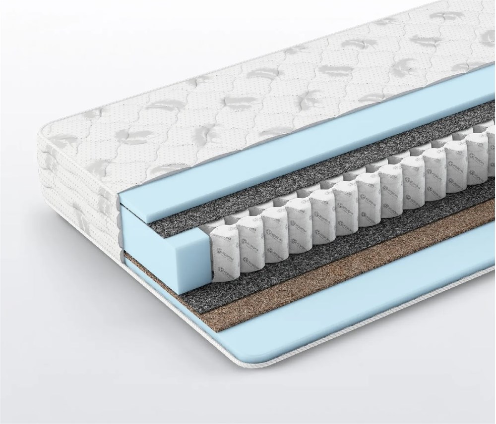 Натуральная кокосовая койра с одной стороны обеспечивает жесткость и равномерное распределение веса, а другая сторона, благодаря сочетанию термовойлока и эластичного пенополиуреатана, подстраивается под форму тела, обеспечивая мягкость и комфортный сон. Данная модель имеет двустороннюю жесткость, подходящую большинству пользователей.